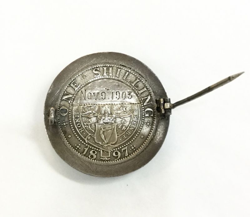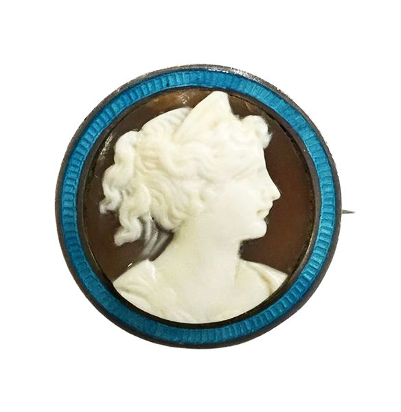 A lovely antique carved conch shell cameo brooch depicting a young maiden set in a Sterling 1897 shilling, framed in blue enamel, engraved Nov 9th 1903.