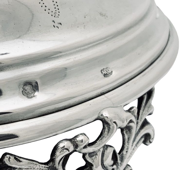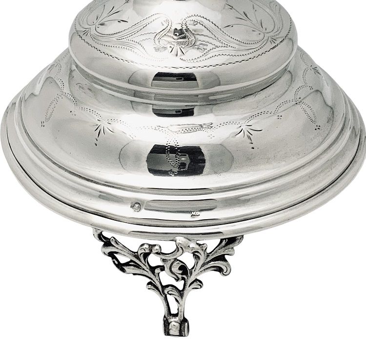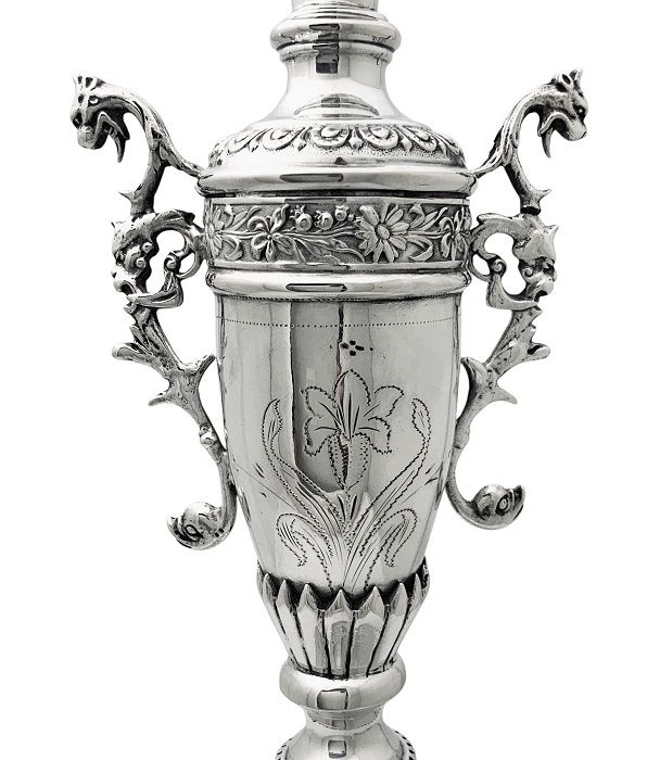 Antique Austro-Hungarian silver Sabbath sticks, 800 Fine Silver.  MD makers mark, baluster form, with finely engraved Art Nouveau decoration of scrolling flowers and garlands, raised on three open foliate feet.  An unusual feature of this pair are the highly stylized dragon / sea serpent handles.