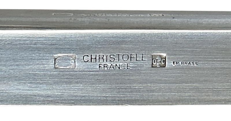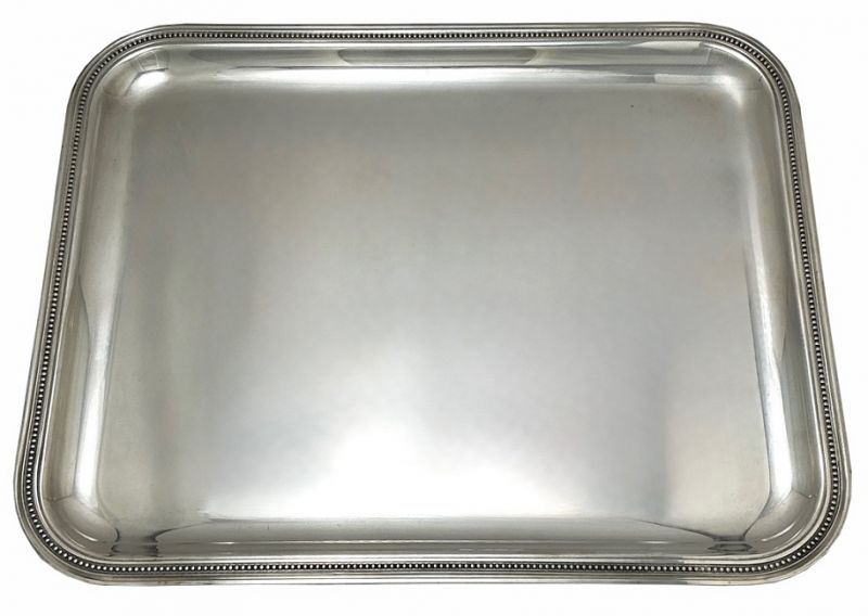 Christofle silver plate rectangular tray with beaded rim.  A ideal size for a cocktail tray to hold drinks or decanters, hors d’ouevres, a three piece tea set or for a vanity table.  The silver plating is in very good condition.