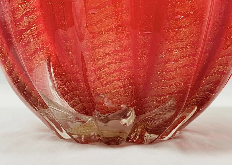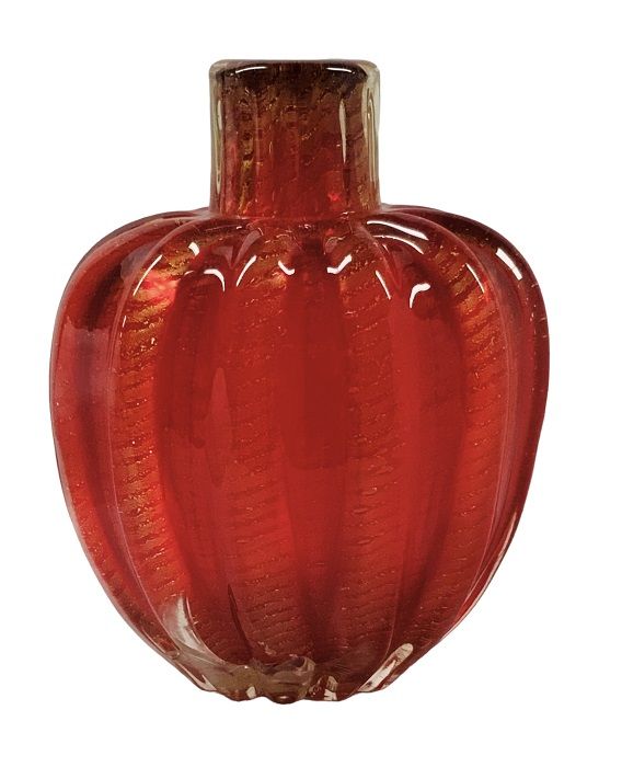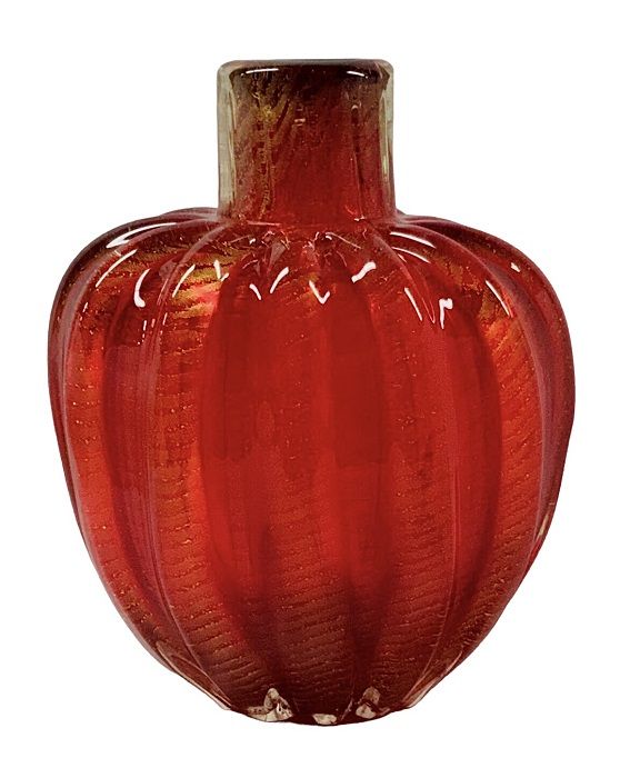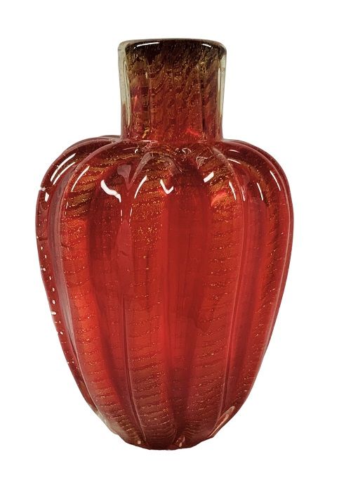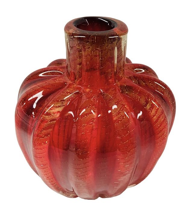 Barovier & Toso glass, Murano Italy.  Similar in design to the Cordonato d’Oro line, designed in 1952 by Ercole Barovier.  The vertically ribbed vase is brilliant red, with encased fine gold dust throughout in diagonal swirls.