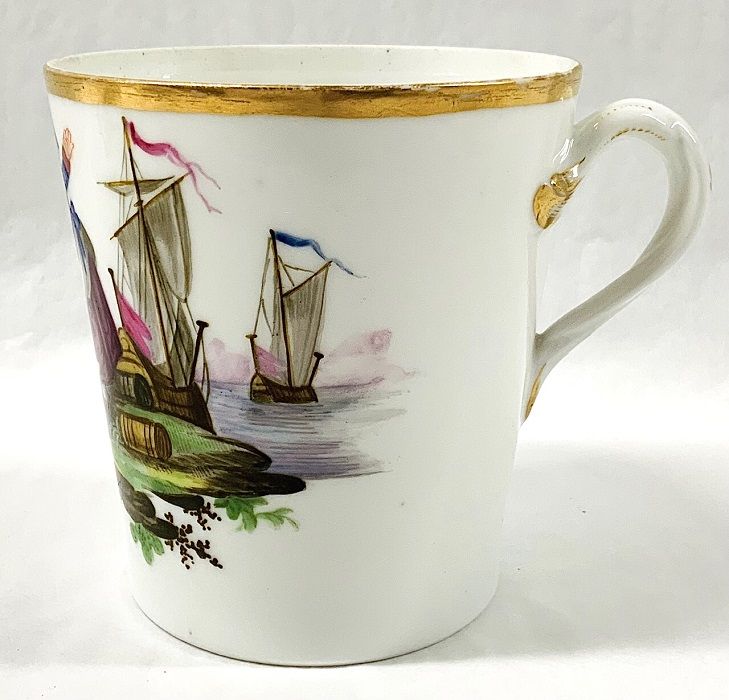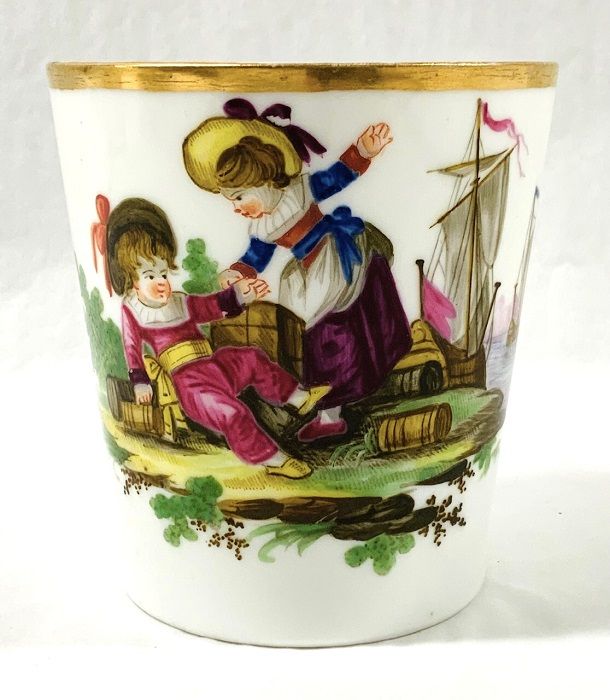 Charming Continental hard paste porcelain oversized cup.  Beautifully hand painted cup depicting playful children in 18th fashion clothing tumbling over trunks with ships in a harbour in the background.