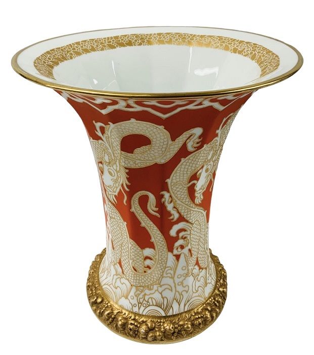 Rosenthal porcelain vase “Ming Dragon” pattern, designed in the 1920’s by Hans Schiffner.  The trumpet shaped vase features a repeating dragon motif in gilded outline against a rich orange ground.  The gilded band of foliate in high relief at the base matches the gilded band on the inside of the rim.