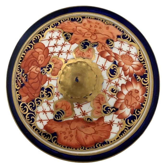 Royal Crown Derby cabinet urn, pattern # 2444, shape 1262, decorated with a floral pattern in an Imari palette and heavily gilded.  Made in England with the Royal Crown Derby date cypher for 1902 on both the urn and cover.