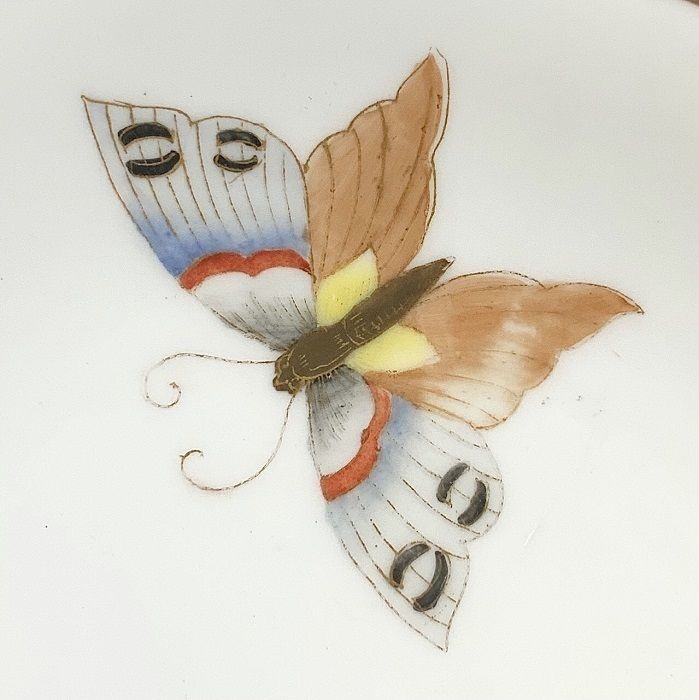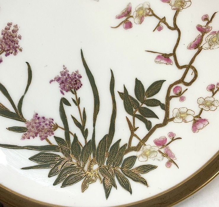 Victorian hand painted cabinet plate, made by Royal Worcester for Caldwell in Philadelphia, circa 1875-80.  This lovely plate depicts a butterfly flying over multiple pink blossoms.