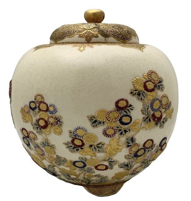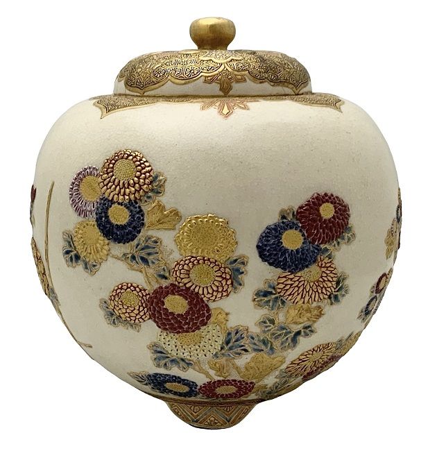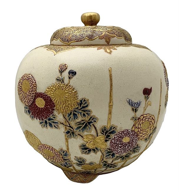 Antique Satsuma ginger jar and cover, showing three scenes of multiple chrysanthemum blooms, with heavy gilding.  Japanese Meiji period, 1868-1912.
