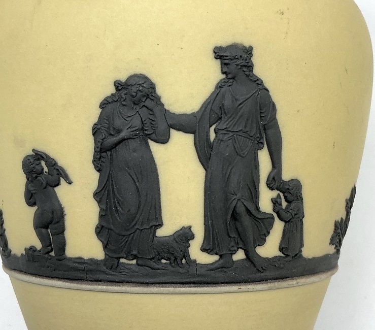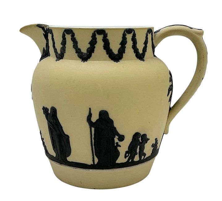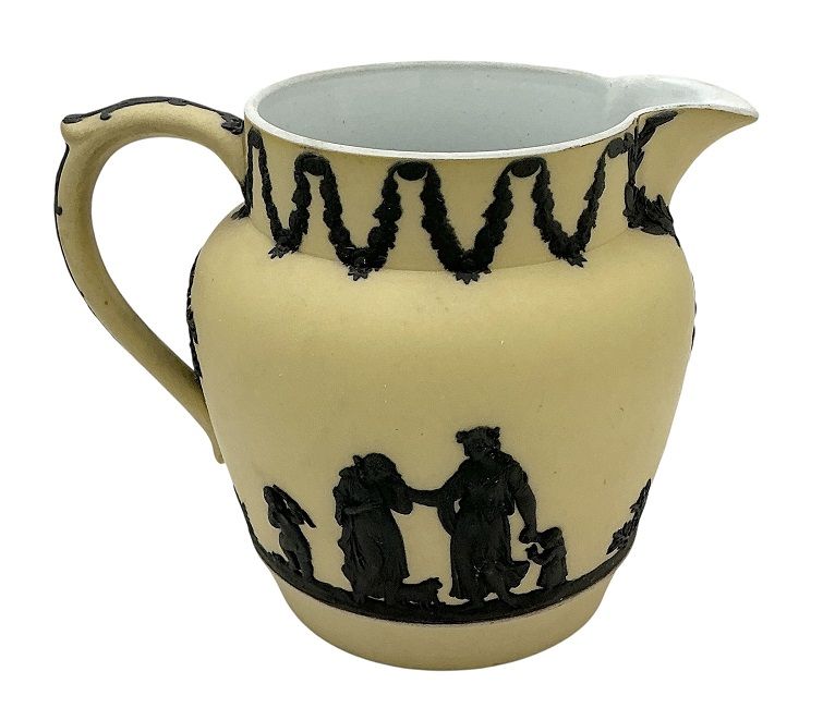 Rare yellow dip Wedgwood Jasperware pitcher.  Decorated with applied black relief of garlands and goddesses.  Made in England, dated 1936.  The pitcher is in good condition with very minor wear only to the body.
