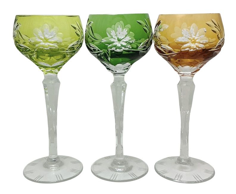 Vintage Bohemian crystal multi-colour hock wine glasses.  The glasses are designed with a layer of colour cut to clear on a facetted stem.  The glasses are all in good condition with very small chips on the facetted stem of the dark green glass.