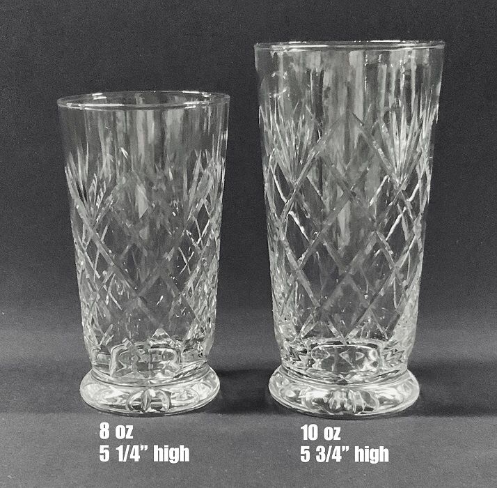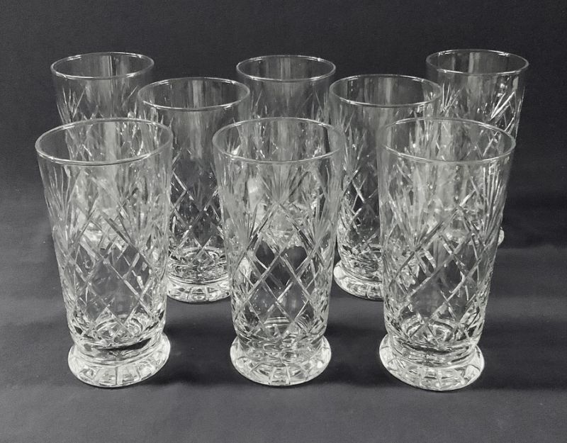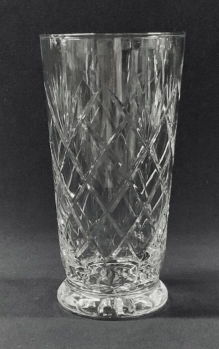 Crystal water tumblers.  This unusual design features a widened base, offering a comfortable grip.  Unmarked, attributed to England, circa 1950.