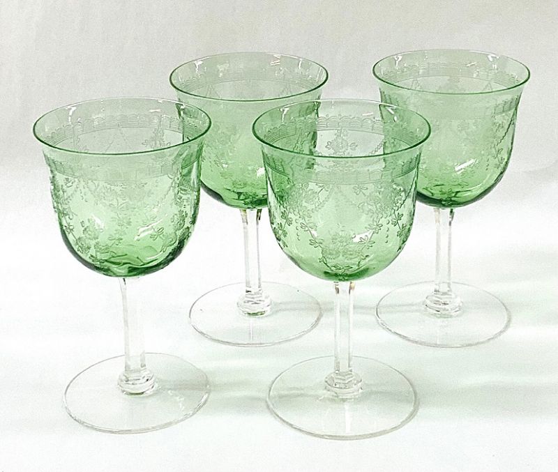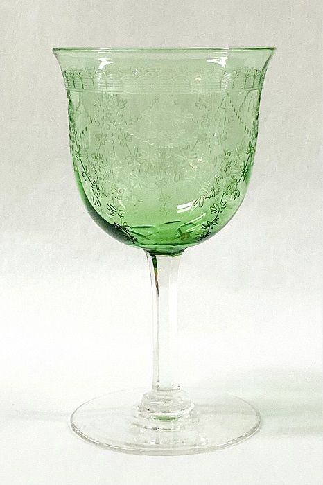The swags of floral garlands are etched on a green bowl with a flared lip, supported by a clear hexagonal cut stem on a simple foot.