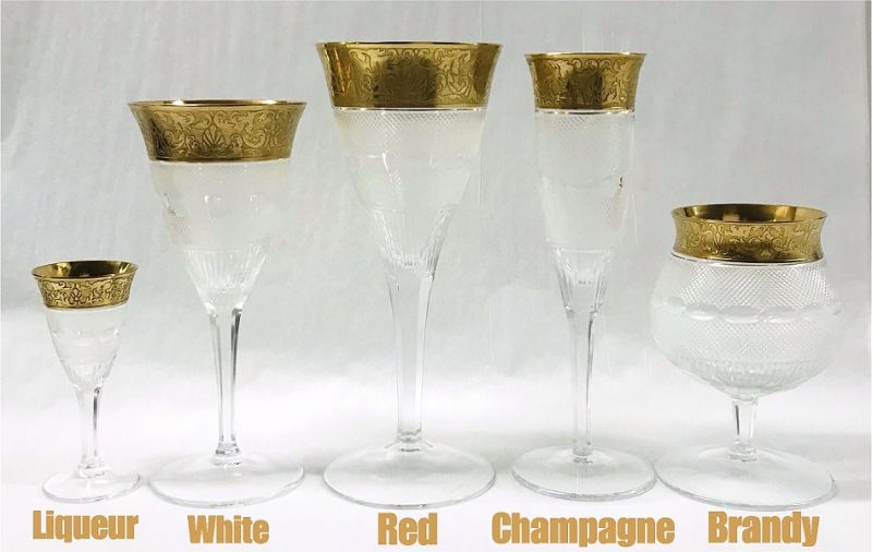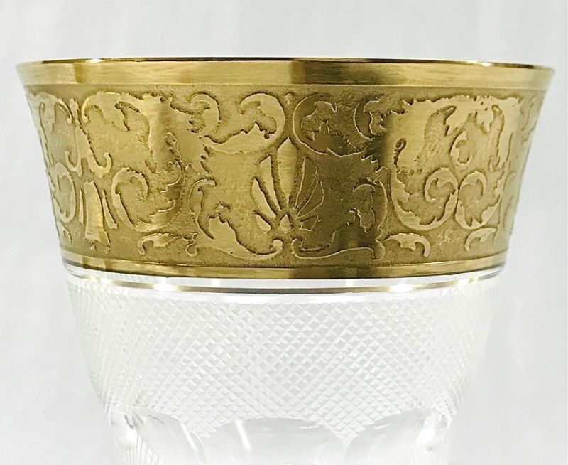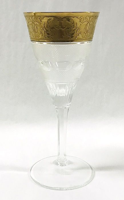 Moser “Splendid” crystal white wine glasses, hand cut and gilded with a wide band of 24k gold.  Below the gilding the bowl is intricately cut with a fine cross-hatched pattern, divided by olive shaped lenses in the middle.  The bottom of the bowl is cut with vertical wedge cuts that transition into the hexagonal stem.  The pattern was introduced in 1911 by Leo Moser and his design team.  The etched Moser trademark is clearly visible on the bases of all the collection.