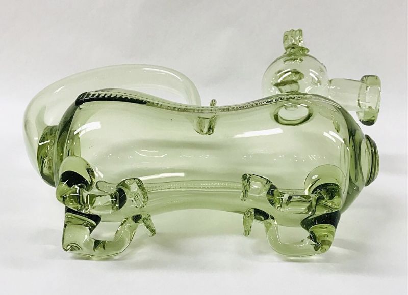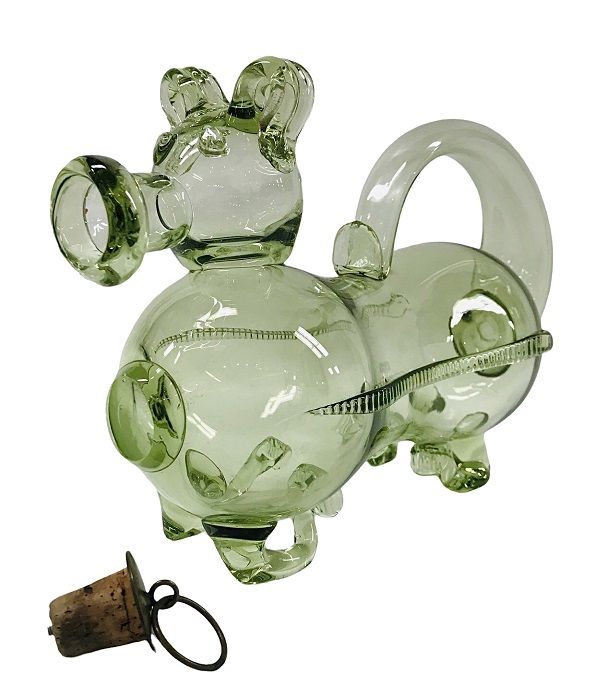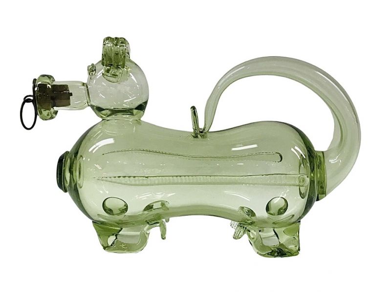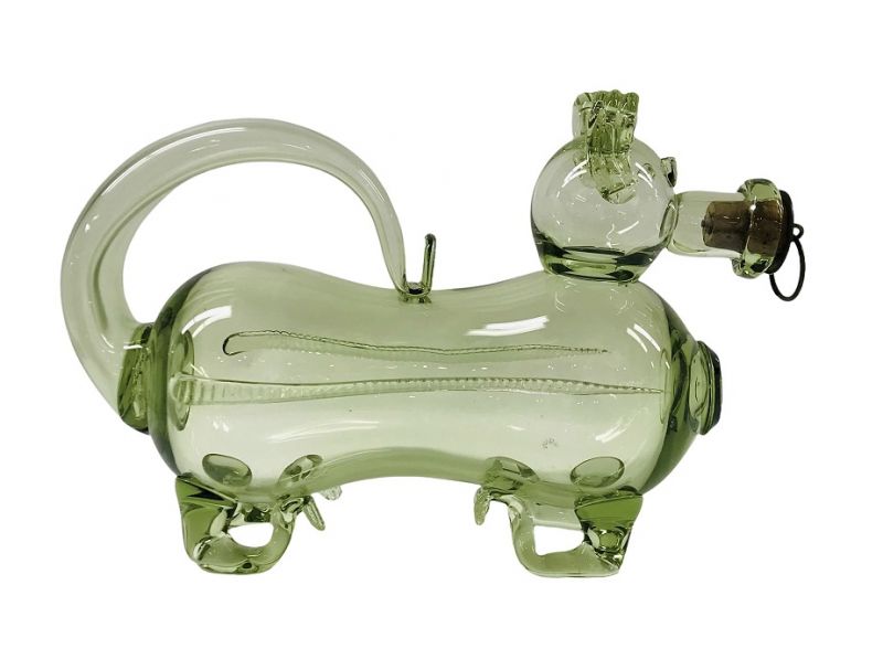 Antique hand blown green glass figural decanter in the shape of a Dachshund.