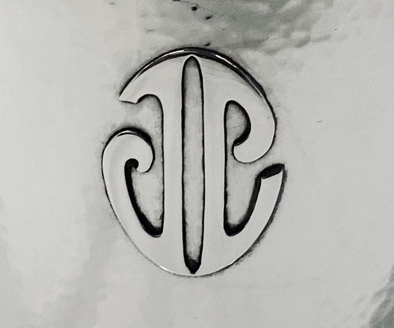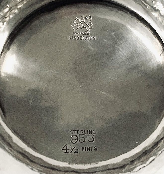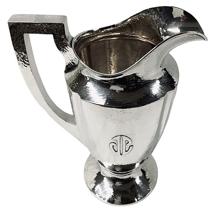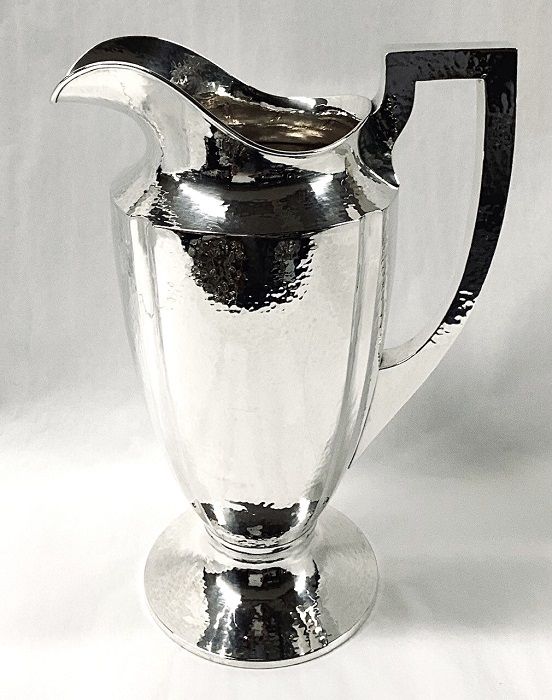 American Arts & Crafts sterling silver water pitcher, Lebolt & Co. of Chicago, Illinois.  Lebolt was known for producing Arts & Crafts hand hammered sterling silver holloware, flatware and jewelry, active from 1908 into the 1940s.  The company trademark was a rampant lion holding a shield bearing a “L”, over the words HAND BEATEN.