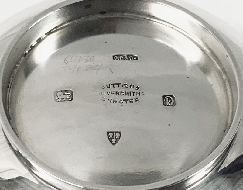 English Art Deco sterling silver quaich, hallmarked Chester 1929.  From the silversmith Charles Perry & Co. of Icknield Street, Birmingham, made for Butt & Co. of Chester.