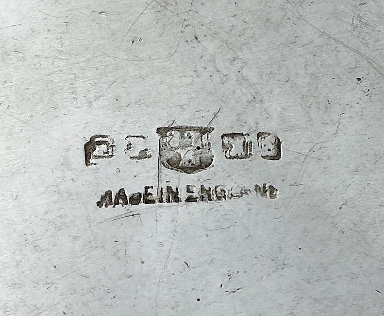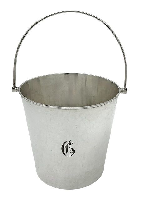 Vintage silver plate ice bucket, made in England, circa 1940.  The hinged handle is functional and will stay in position.  Monogrammed with the initial “G” in Old English script on one side only.  With minor wear to the silver plating, consistent with age and use.