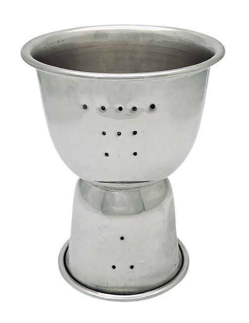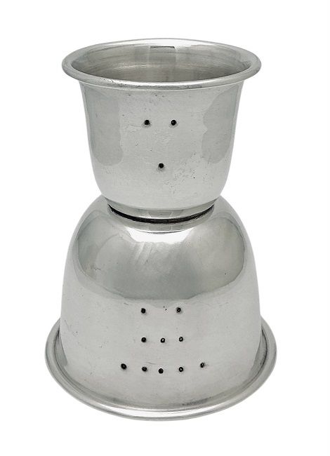 Mid-Century Modern sterling silver double ended jigger, made in Taxco, Mexico, circa 1960.  The number of impressed dots 1 & 2 and 2, 3 and 5 signify the ounces for measuring.  A fun design and useful item for a well stocked home bar.
