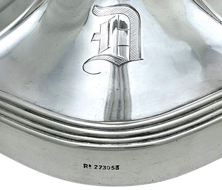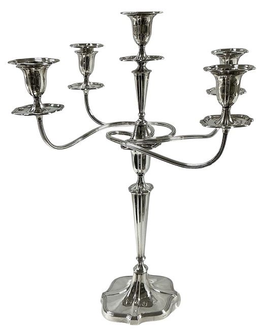 Elegant Edwardian sterling silver 5 light candelabra, hallmarked Sheffield 1909.  From the silversmith Hawksworth, Eyre & Co. Ltd. of Rockingham Street, Sheffield, England *.  The candelabra is designed in the manner of late eighteenth century Georgian era silver, with a gently fluted tapered central column, rising from an almost oval base; the shape of which is repeated in the junction of the branches and the original bobeches.  The base is monogrammed with the letter “D” in Old English font and all of the component pieces are hallmarked independently.