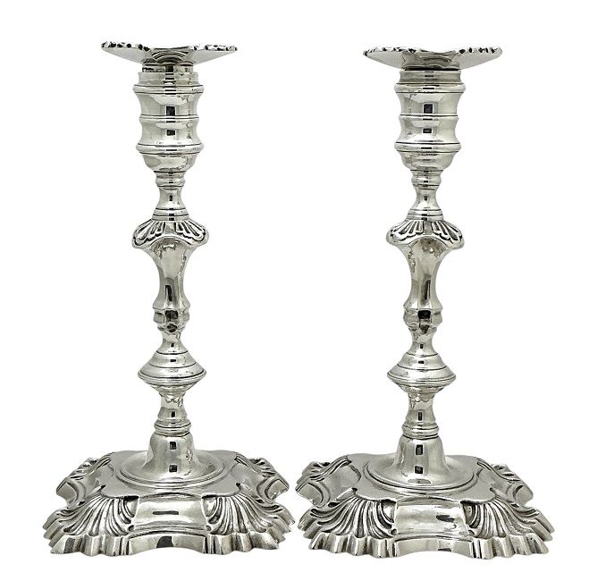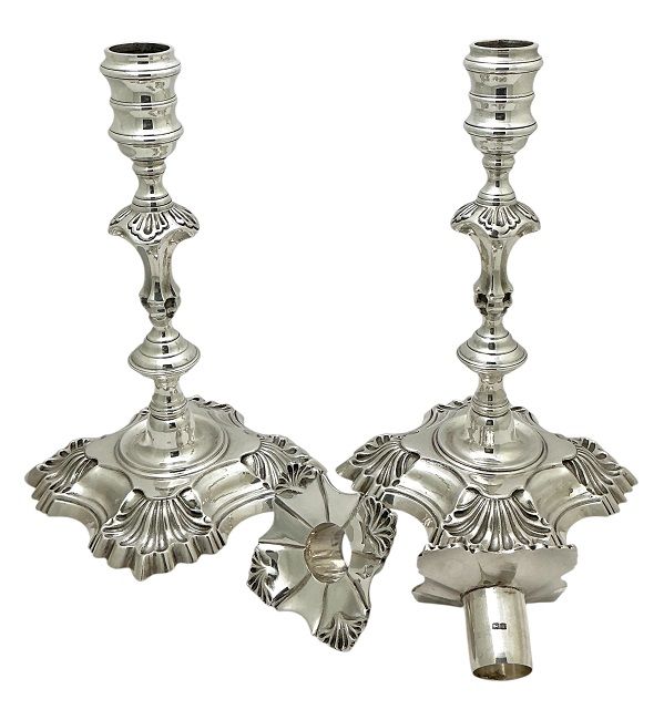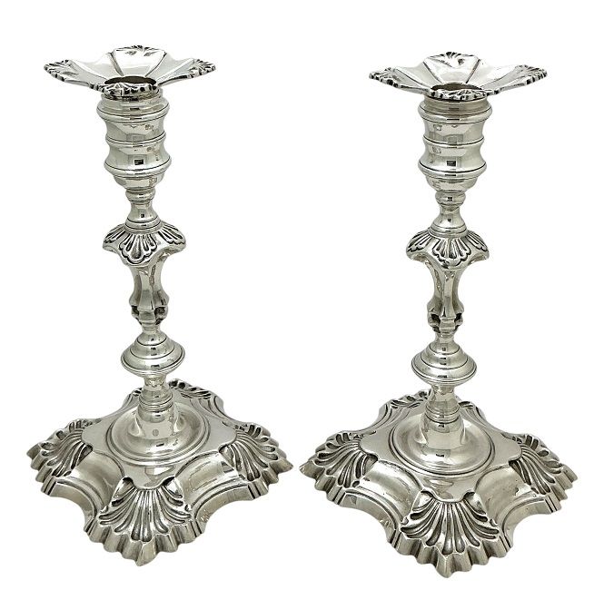 A fine pair of sterling silver candlesticks, hallmarked Birmingham 1969.  From the silversmiths J. B. Chatterley & Sons Ltd. of Newtown Road, Birmingham, in business circa 1925-93.  The candlesticks are made in the manner of the silversmith William Cafe, George II era cast silver candlesticks circa 1740s.  Featured period design elements include the lobed column and stylized shell corners, with a well on the base to contain melted wax run off.  The candlesticks are fully hallmarked, including the original bobeches.  The candlesticks have a substantial weight and are  in very good condition.