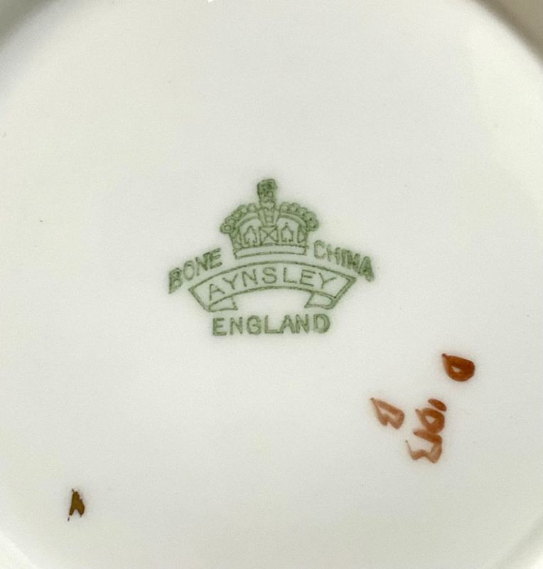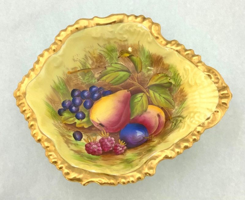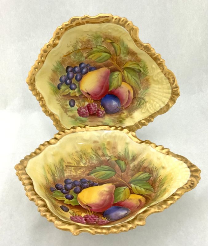 Aynsley bone china Orchard Gold pattern shell shaped dishes, with gilded rims. Signed D. Jones (Doris Jones, active 1938-69), Aynsley, England.