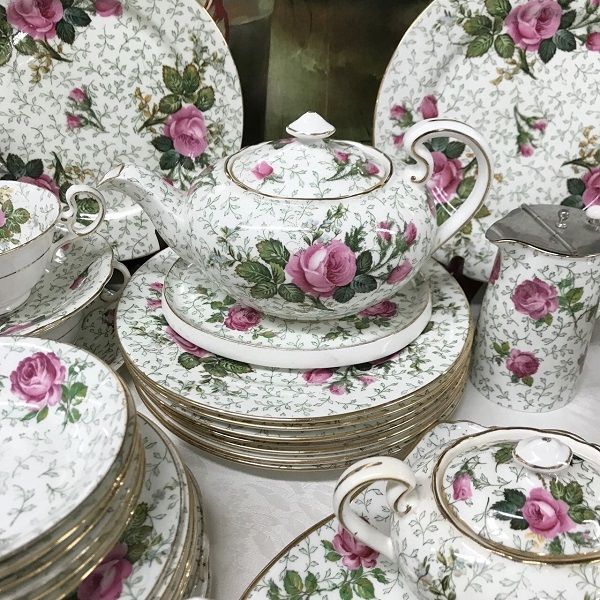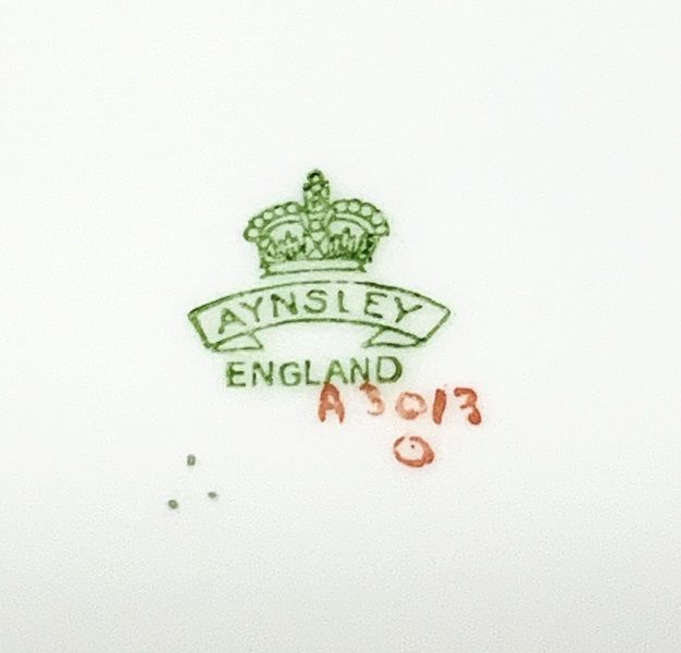 Edwardian era Aynsley bone china tea / luncheon set, pattern # A3013, circa 1910.  This elegant chintz set is decorated with pink roses and green leaves.