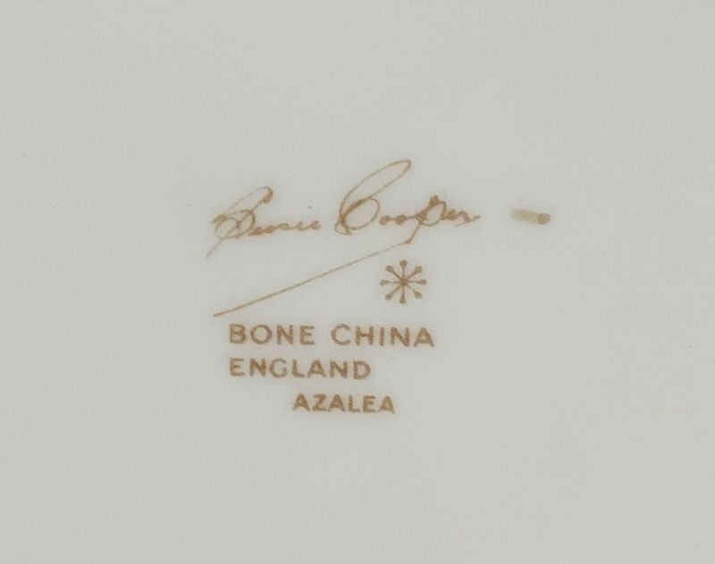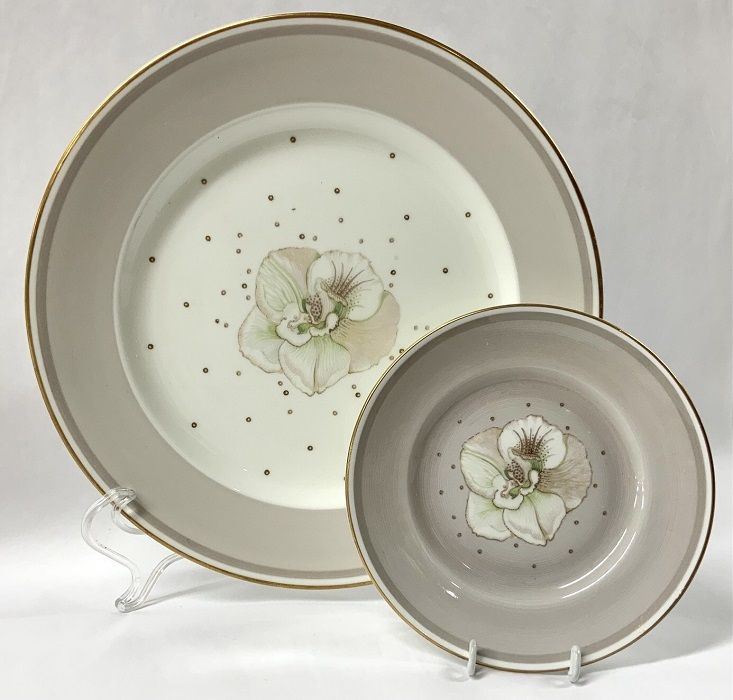 Susie Cooper bone china dinnerware “Azalea” pattern, grey with a gold rim, circa 1950s.