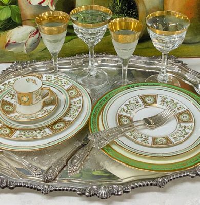 5.  M. Redon Limoges dinner set, green Greek Key border, $1500 for the set.