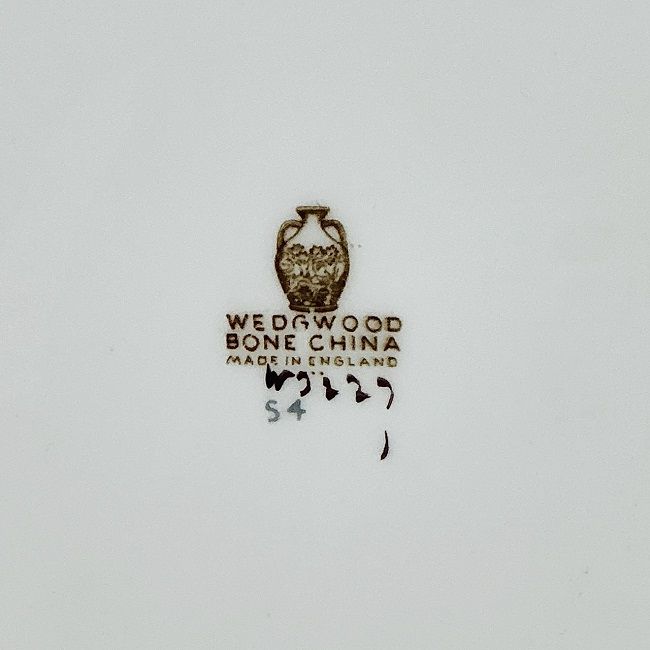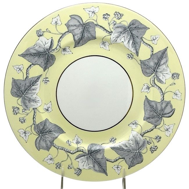 Wedgwood Josephine Yellow dinnerware, pattern # W3927, made circa 1941-64.  The pattern features a wide yellow border decorated with grey ivy leaves.