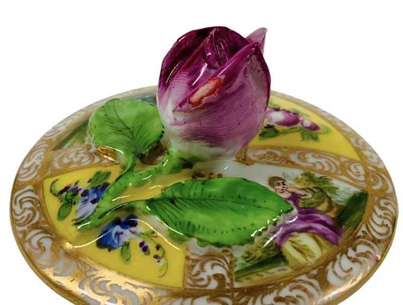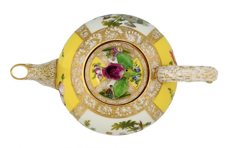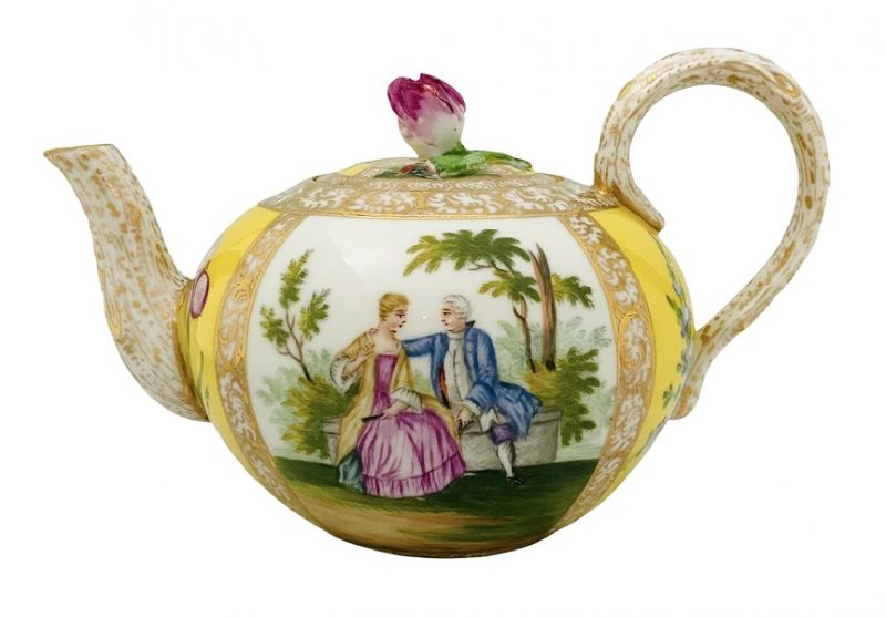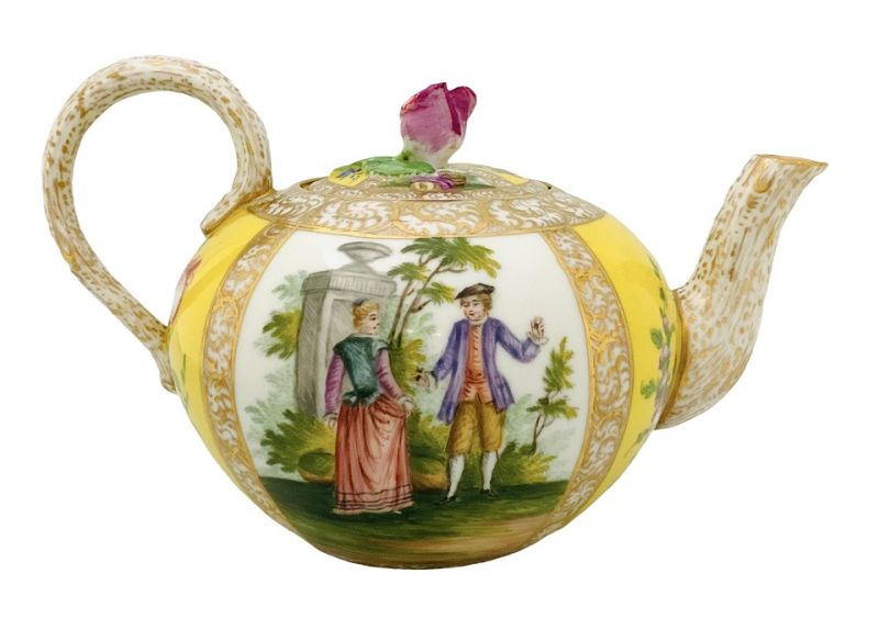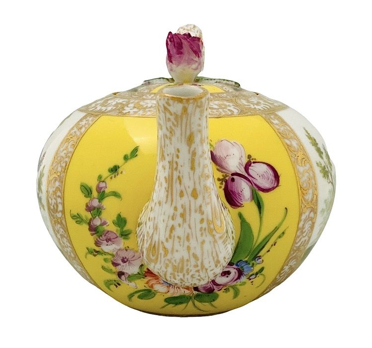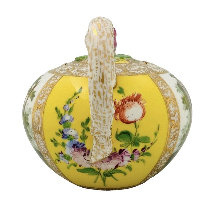 Crown Dresden/Helena Wolfsohn * hand painted porcelain teapot with Rococo inspired courting scenes, circa 1881-1890. The two romantic scenes are painted in panels, alternating with floral decorated panels painted against a bright yellow ground.  The branch form handle is asymmetrical to further emulate the naturalistic elements of the design.