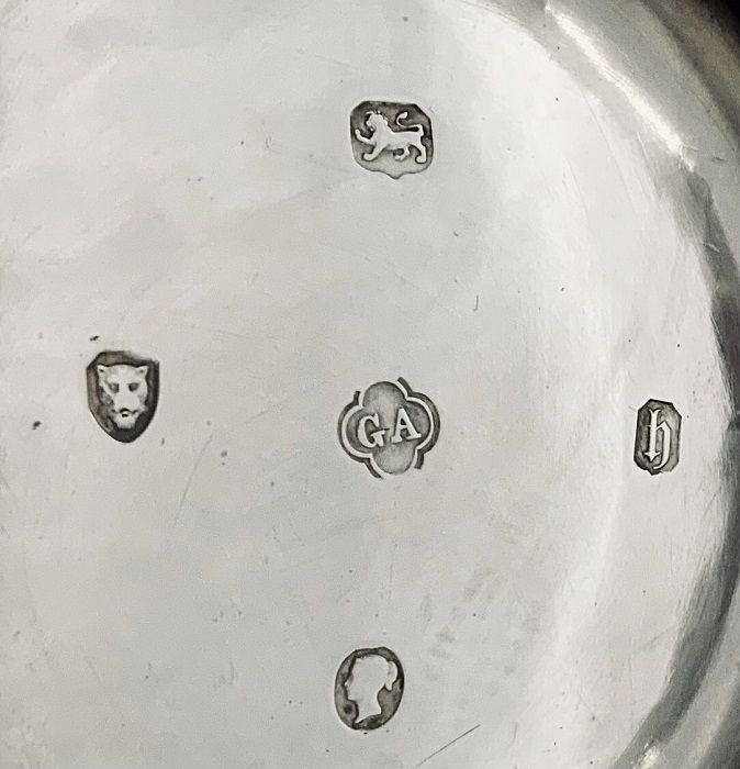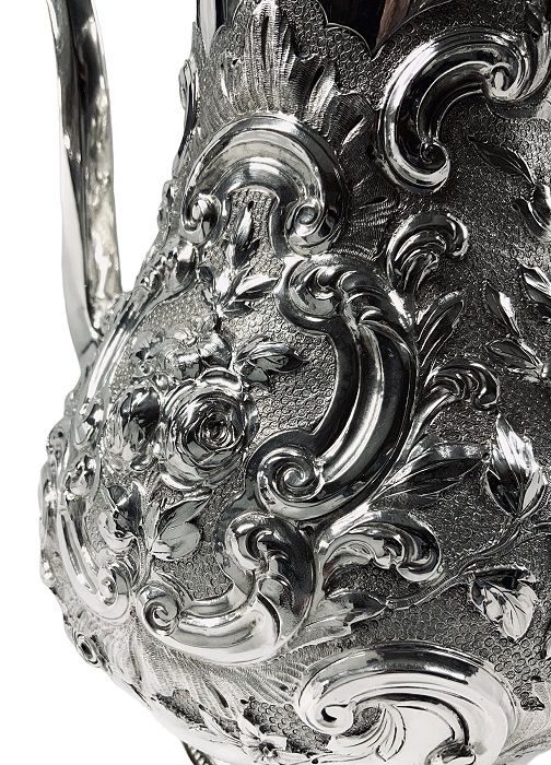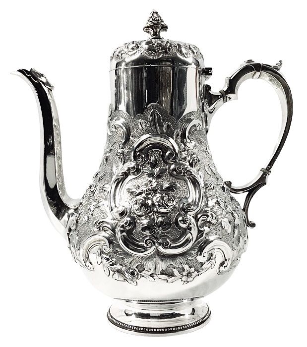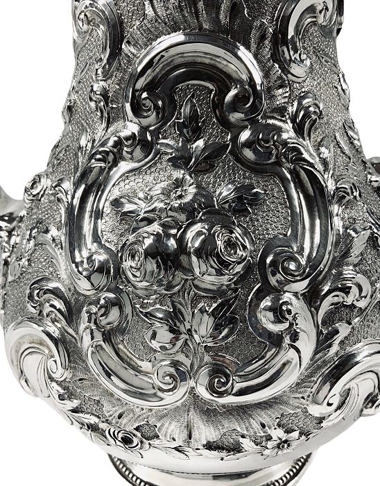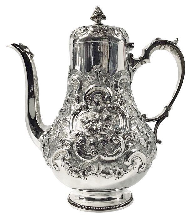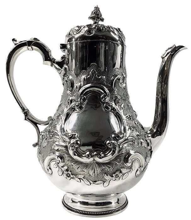 The body of the coffee pot is a simple baluster shape, exquisitely worked in repose, featuring roses, leaves and scrolls against a stippled background, rising from a simple pedestal foot with a beaded edge.  The elegant handle emulates tracery from Gothic architecture.  The pot has one blank cartouche, suitable for a monogram or presentation engraving.