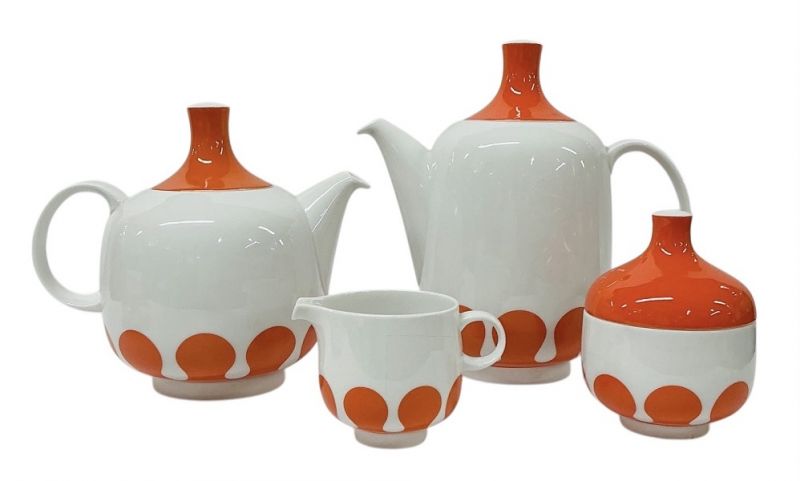 Vintage Rosenthal Studio-Linie (Line) porcelain tea and coffee service for 10.  The pattern is “Mondial”, shape “Plus”, designed by Wolf Karnagel * in 1969, in production 1970-77.
