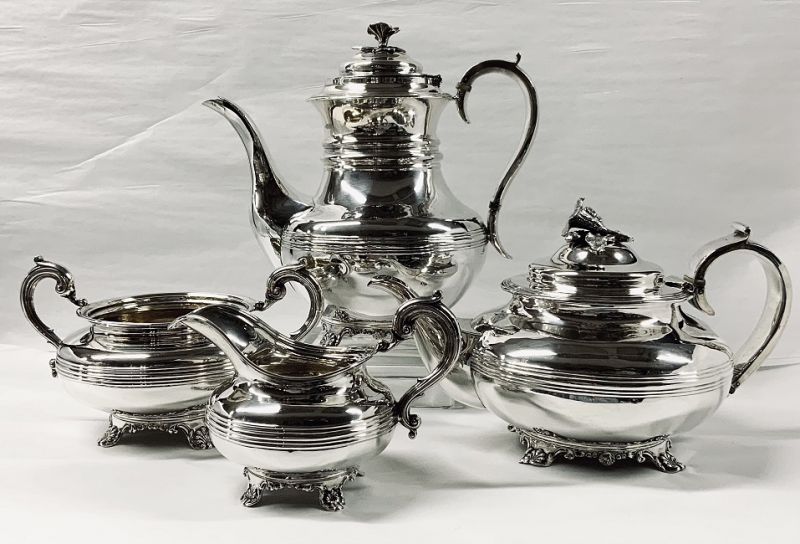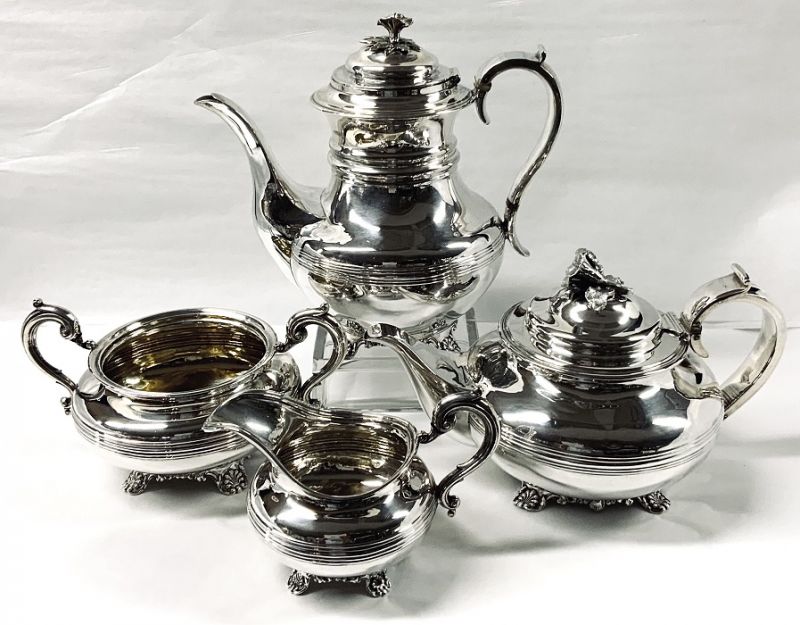 A William IV assembled four piece sterling silver tea and coffee set, English hallmarks for London 1834.  The pattern matching is remarkable in that all four pieces are the same pattern and date, from different silversmiths.  The simple shape is decorated only with banding at the middle, elaborate floral finials and shell motif bracket feet.