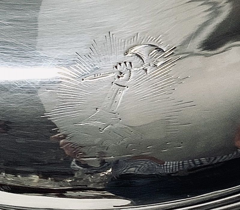 The teapot is from the silversmith Jonathan Hayne and is crested with an upright thrusting arm holding a battle axe.