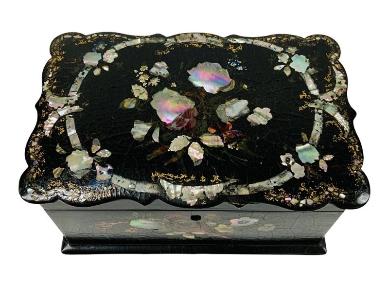 Victorian papier-mâché tea caddy.   Decorated on the scalloped edge top and three sides with Mother of Pearl inlay in the form of floral sprays, with hand painted and gilded detail.  The interior has two metal foil lined compartments with the highly ornamented gilded decoration on the lids intact.  English, circa 1850.
