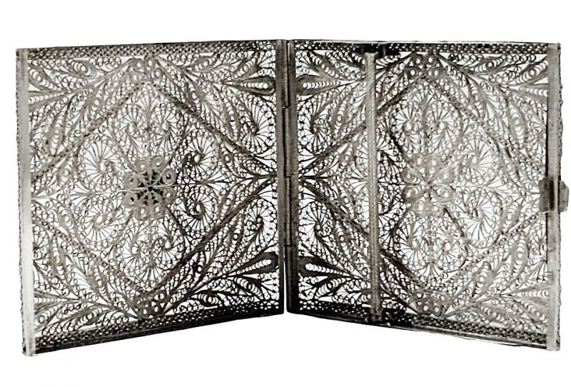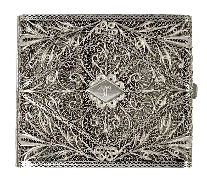 Filigree sterling silver case, intricately detailed.  Monogrammed with a “T” on one side.