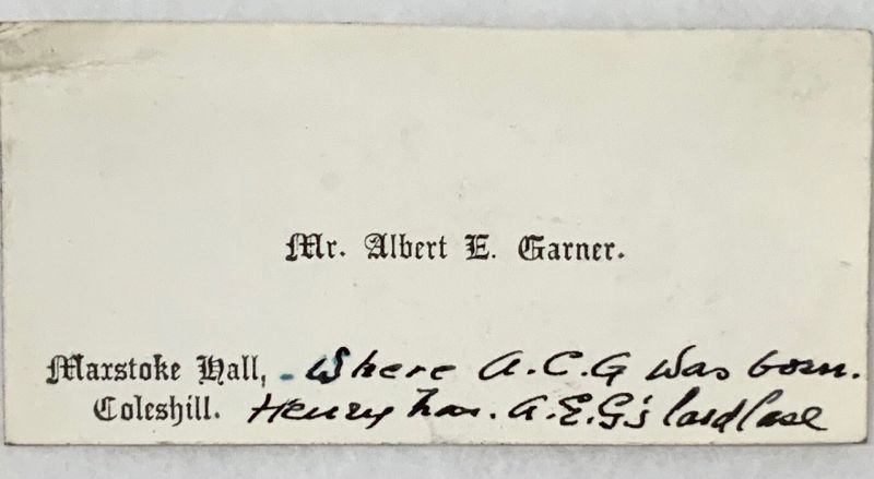 Victorian English sterling silver calling card case, fully hallmarked for Birmingham 1898.  The hinged case is slightly convex; designed to fit into a suit jacket pocket easily.  Intricately hand engraved front and back and trademarked for Joseph Hawkins of Birmingham whose work dates from circa 1889-1902.  Monogrammed in Script and complete with the original card of Mr. Albert E. Garner.