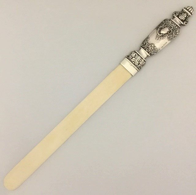 Victorian era sterling silver and ivory Paginator, English, hallmarks for Birmingham 1898.  A Paginator, or page turner, was used to gently lift and turn the pages of large books, so as not to leave fingerprints on the parchment.