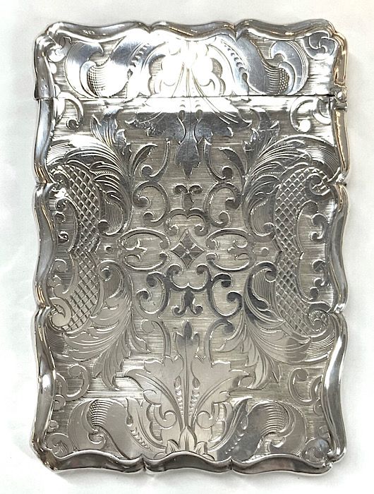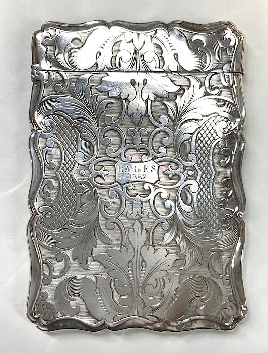 Victorian sterling silver calling card case, English hallmarks for Birmingham, 1860. From the silversmiths Aston & Son (Thomas Aston & William Aston) of Regent Place, Birmingham.