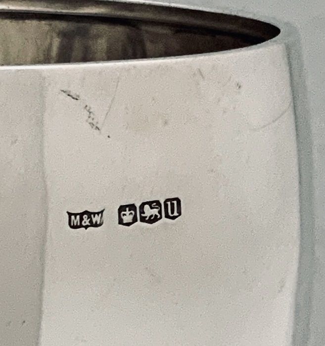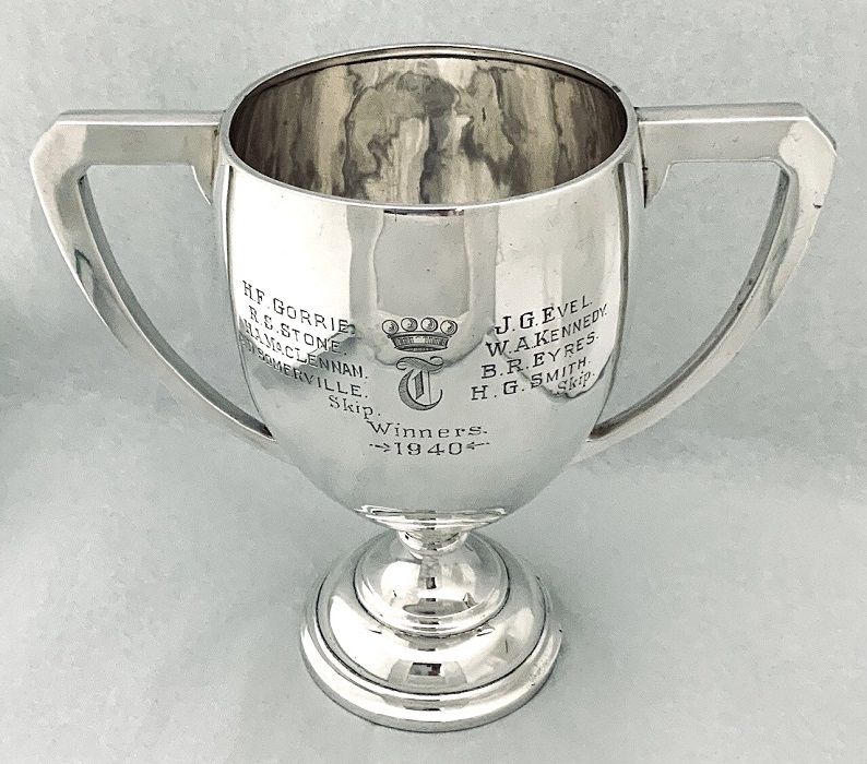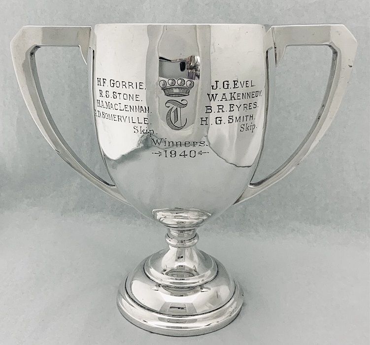 Art Deco sterling silver curling trophy, English hallmarks for Sheffield 1937 and presented in 1940.  From the prolific silversmiths Mappin & Webb of Royal Cutlery Works, Norfolk Street, Sheffield.