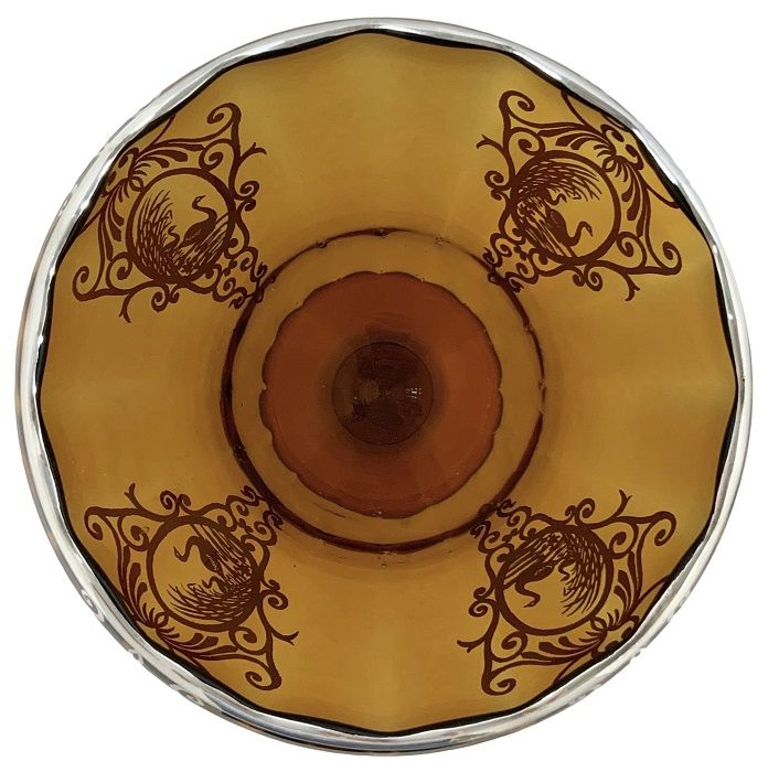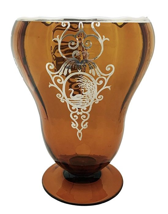 Art Deco silver overlay on amber glass vase.  The vase has a repeating design of swans swimming near a shoreline, with a subtly undulating rim suggestive of waves.
