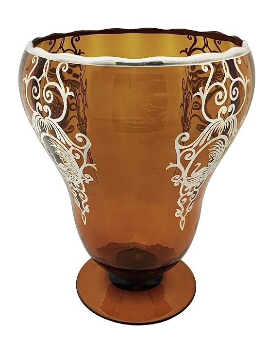 Art Deco Silver Overlay On Amber Glass Vase