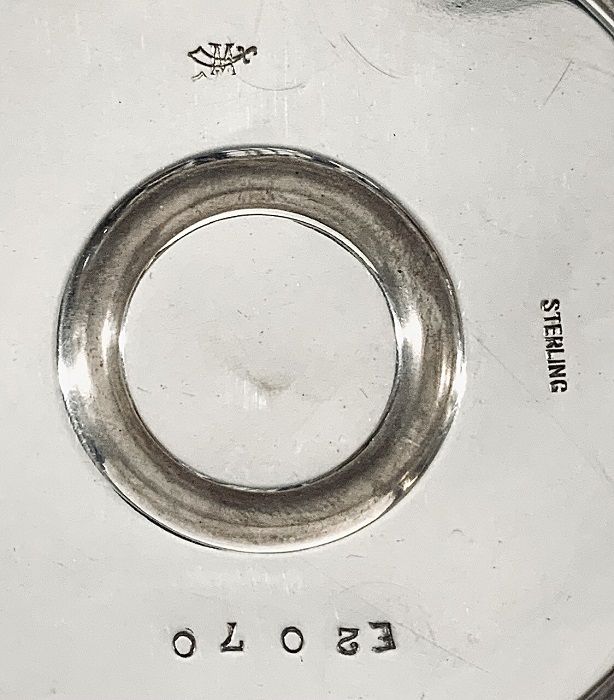 Art Deco sterling silver trumpet shaped vase, made by Matthews & Co. of Newark, NJ., circa 1920.  The corporate trademark for Matthews & Co. was a scimitar, super imposed on a capital “M”.  Matthews & Co. were incorporated in 1907 and merged with Eleder-Hickok circa 1931.