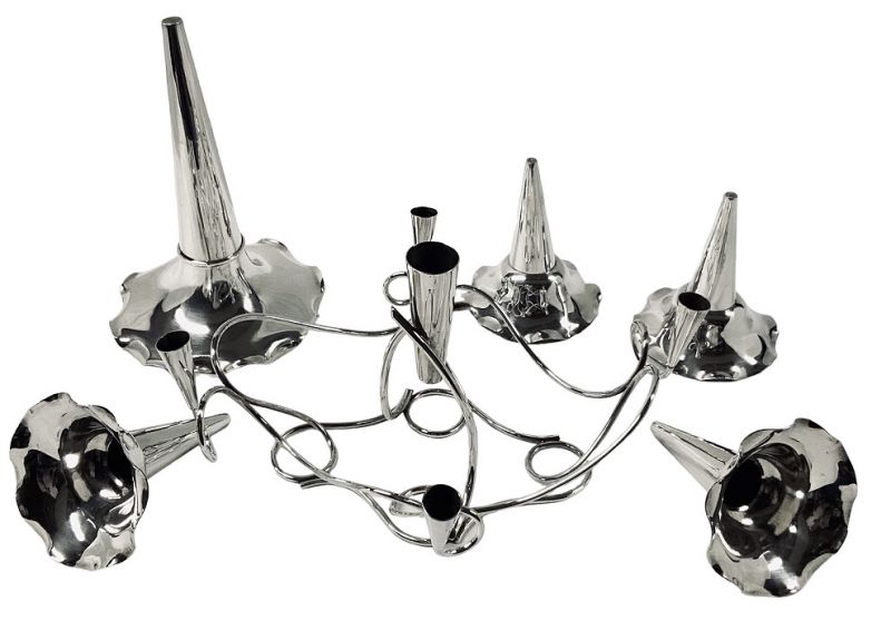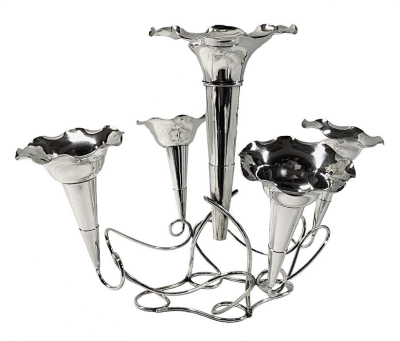 The four smaller flutes are arranged symmetrically around the taller central flute on an undulating wire frame.  The frame is marked C & F, EPNS 4329.  C& F is the trademark for Coles & Fryer Ltd., active circa 1903 in Birmingham, England.