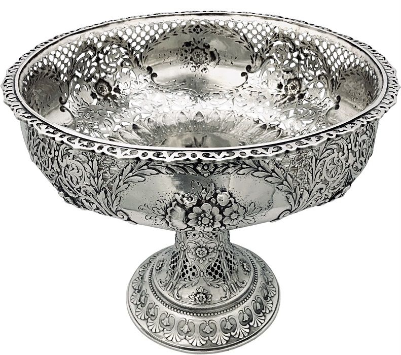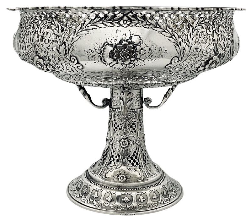 Highly ornamented 800 Fine Silver pedestal fruit bowl, from the silver firm Lazarus Posen Witwe * of Frankfurt and Berlin, Germany, circa 1900.  The pedestal bowl has raised panels of flowers in repousse work on a largely reticulated body, suggesting flowers growing on a trellis.  The underside of the bowl and the flared pedestal foot features a stylized acanthus leaf frieze.  Monogrammed with a single “G” in the center of the bowl.