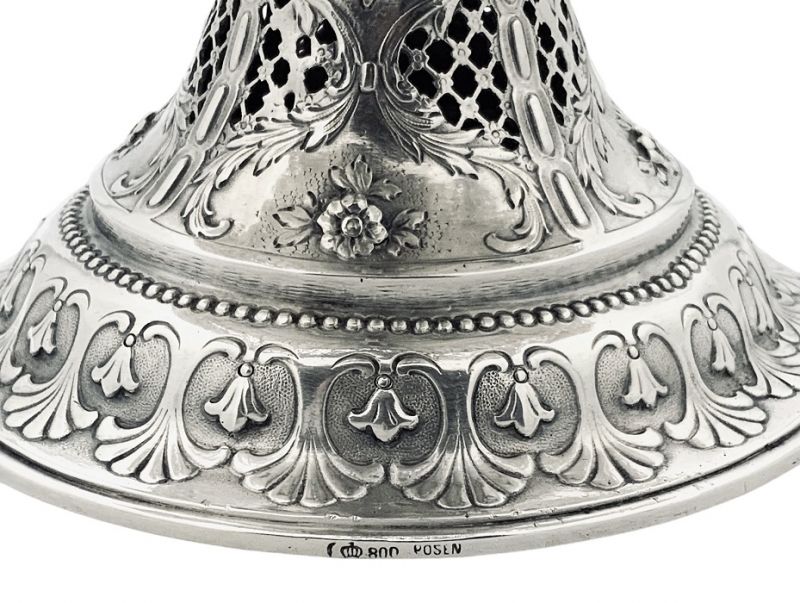 * Lazarus Posen Witwe (widow) is unique amongst 19th and 20th century German silver manufacturers in that the owner and director was a Jewish woman.  The firm was established in 1869 in Frankfurt by Brendina Wetzlar, the widow of Lazarus Jacob Posen, a silversmith  and retailer of Polish descent.  The firm was the largest supplier of Judaica in Germany in the late 19th century.  Mrs. Posen’s son, Jacob L. Posen joined the firm in 1880, followed by her grandsons, Jakob, Hermann and Moritz Posen.  By 1900 the larger staff of chasers and engravers were producing some of the finest silver goods in Germany.  In 1903 the company received a royal warrant and opened a second location in Berlin.