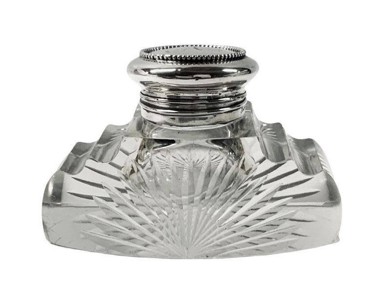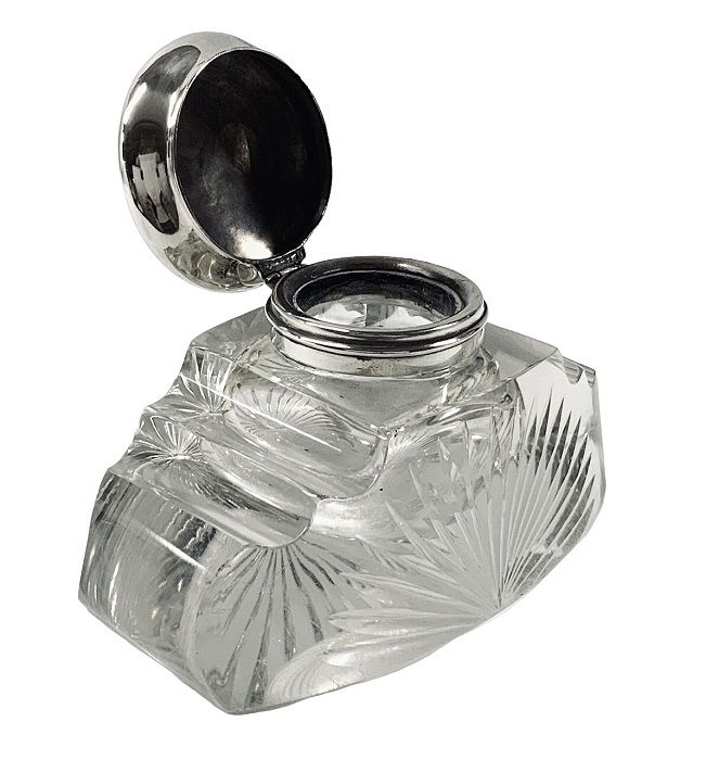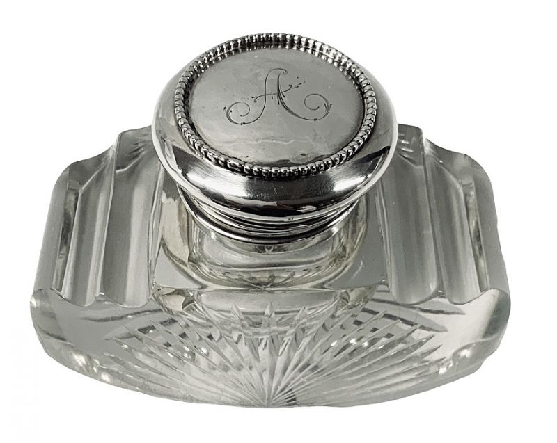 Antique crystal and sterling silver inkwell, American, circa 1910.