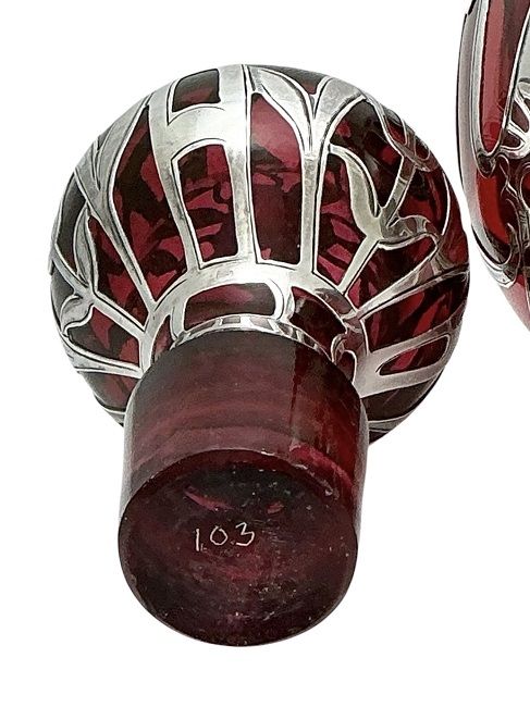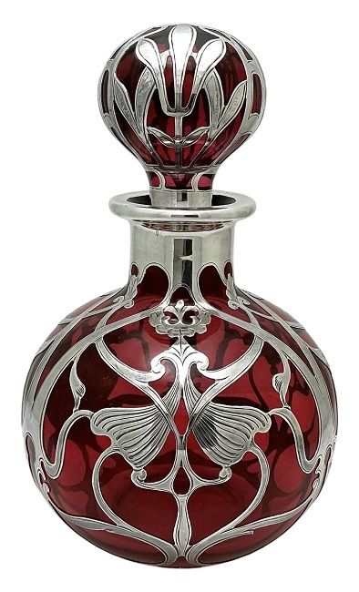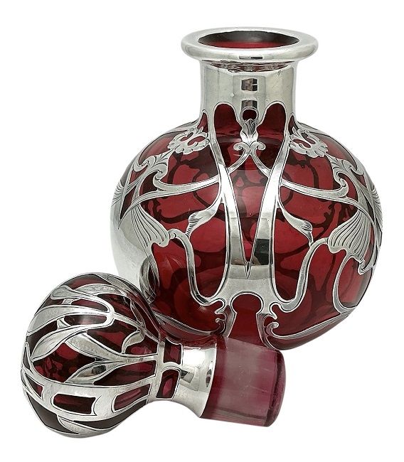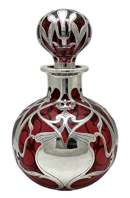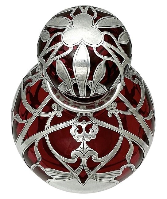 Art Nouveau Gorham Silver Overlay Cranberry Glass Scent Bottle