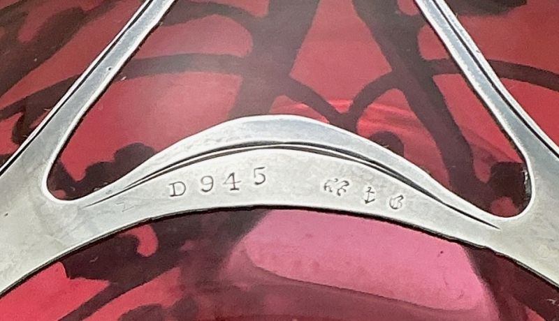 Art Nouveau cranberry glass and silver overlay scent bottle, made by Gorham Manufacturing Company of Providence, Rhode Island , circa 1905.  The scent bottle is of a substantial size, made of a deep red cranberry glass with heavy silver overlay.  The bottle has a 2” diameter blank shield, suitable for a monogram or presentation engraving.   The silver frame is identified with the impressed marks:  D945 (a design reference number) and the symbols for a lion, anchor and an Old English “G”; the Gorham trademarks.