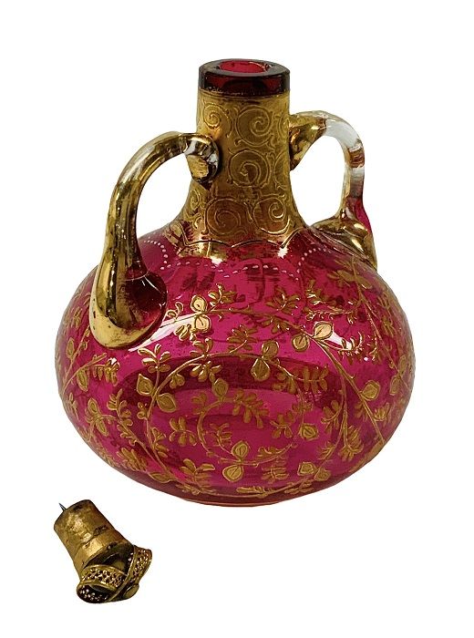 Victorian cranberry glass scent bottle, attributed to J. & L. Lobmeyr of Vienna, Austria, circa 1880-1900.  The hand gilding and enamelling is done in an overall design of scrolling interwoven vines.