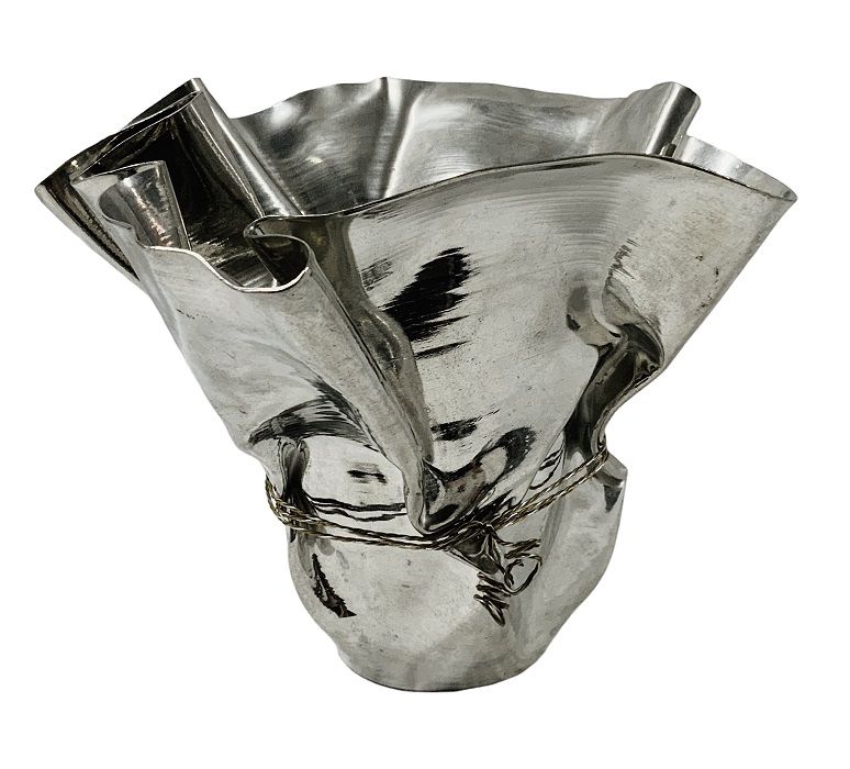 Chaudron pewter hankerchief form vase, tied with a two-toned metal “ribbon”.
