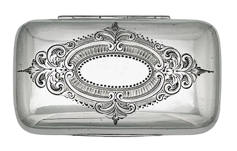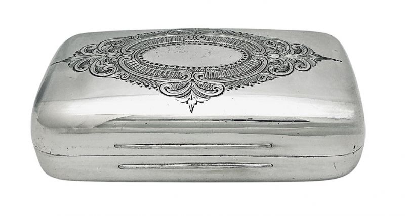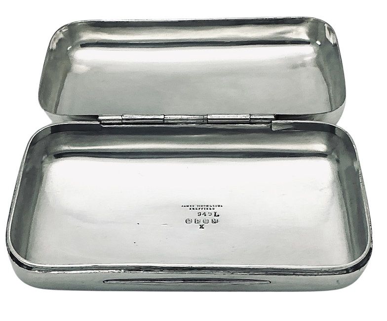 The hinged lid is ornately engraved, framing a central oval suitable for a presentation engraving or monogram.  The condition of the plating is in very good.