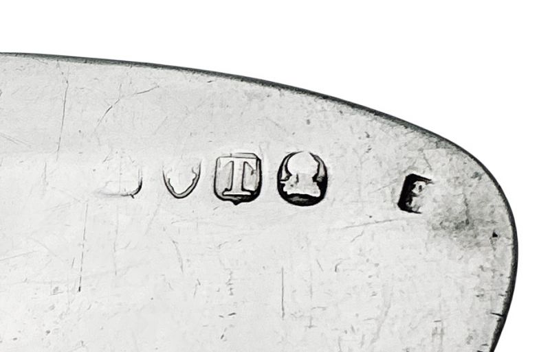 George III era sterling silver fish slice, English hallmarks for London 1814.  The fish slice has a pierced blade and a filled handle.  The silversmiths mark is partially rubbed but it can be deciphered to be that of Thomas Wallis II and Jonathan Hayne, mark registered for their partnership of 1810-1820.  The slice is hand engraved with a crest of a rearing antelope rising out of a 5 point coronet.
